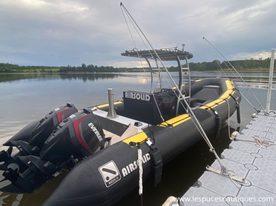 Pneumatique à coque rigide modèle Airsolid-27. Détails: Coque en aluminium, tube en Polyuréthane 26", console en fibre de verre avec toit en aluminium. Moteurs BRP Etech 150 Hp utilisé moins de 500 heures. Deux réservoirs de 40 gals/ ch, conduite hydraulique, pompe de cale hydraulique, pont auto-videur, rangement sous le pont, banc/ bolster, bancs double sur l'avant avec table amovible, bitte de remorquage, feu de navigation, projecteur télécommandé. GPS/ sondeur Garmin, radio VHF, stéréo. Remorque Excalibur (2020) à double essieux avec frein hydraulique, toile d'entreposage. Immatriculation Canadienne, excellente condition, un propriétaire, toujours utilisé comme bateau de plaisance, entretenu par mécanicien, entreposé avec toile durant l'hiver. Pour plus d'information, contacter Richard Boulet Cell (418) 520-3020. PRIX DEMADÉ 79,900$ CAD.