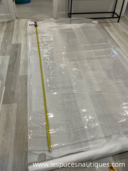 Rouleau de vinyle clair 30 gauge ( .030 po.) d’épaisseur, 54 x 84 po. Peut être cousue avec une machine à coudre régulière pour réparer les fenêtres du dodger, Bimini ou autres. Neuf, jamais servi