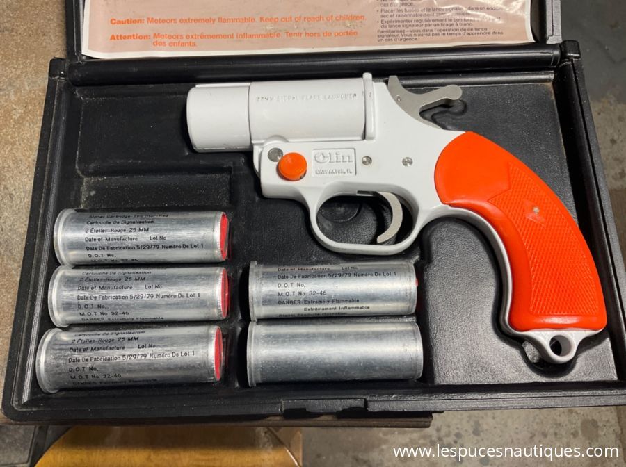 Ensemble de fusées de détresse de marque ''Olin Marine'' avec son pistolet (lanceur cal. 12) en aluminium (qualité supérieure) et non en plastique. Indispensable pour la navigation en toute sécurité. Visiblilité de jour 2 Km et de nuit 20 Km . Le tout dans un étui de protection en plastique. Offre raisonnable OBO .